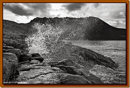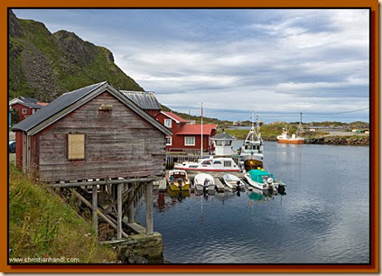 Kurz nach Mittag kommen wir in Stö an, der winzige Fischerort liegt wirklich am Ende der Straße mit offenem Blick auf die Nordsee. Der Hafen mit Rorbuern ist recht malerisch, außerdem findet gerade ein Markt statt. Wir plaudern mit einer Dame aus Belgien, die hier lebt und einen Kunsthandwerkladen betreibt. Pünktlich nach Wettervorhersage beginnt es dann um 14 Uhr zu regnen. Schließlich bleiben wir auf dem (auch schon geschlossenen) Campingplatz stehen. In einer längeren Regenpause wandern wir ein Stück die Küste entlang, die Buchten, teils mit Sandstrand, teils mit Kieseln, sind malerisch, aber das Licht ist nicht sehr kräftig. Wir sehen auch Seeadler kreisen, von denen es hier eine ganze Menge geben soll. Die Gegend hat einen sehr ursprünglichen Reiz, wir hoffen auch auf ein Wolkenloch morgen.