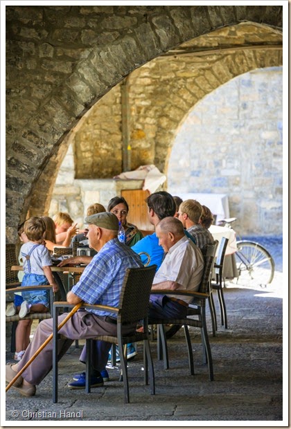Wir kommen so zurück, dass sich ein Mittagessen in Benasque, im selben Lokal wie gestern, gut ausgeht, diesmal können wir auch im Freien sitzen.