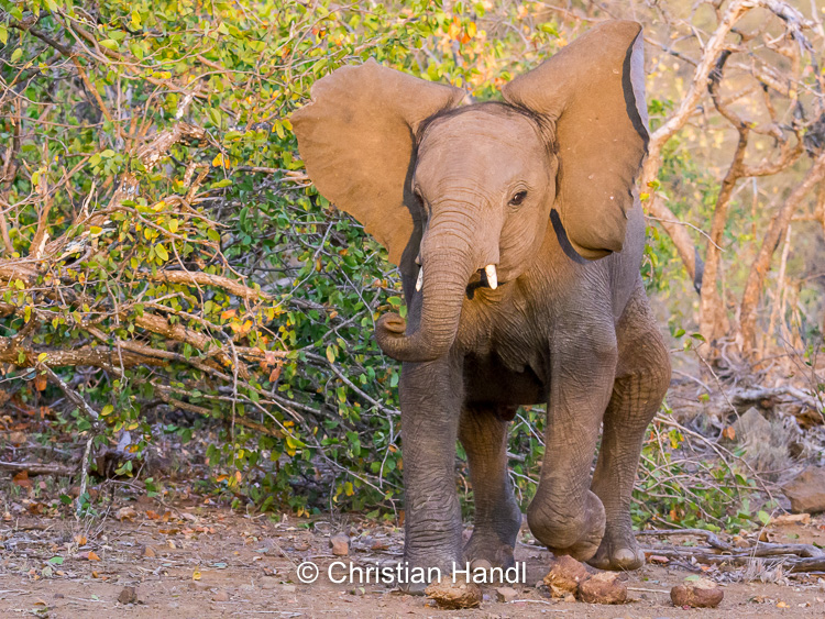 Heute steht eine längere Fahretappe an. Gleich nach dem Camp stoßen wir auf junge verspielte Elefanten.